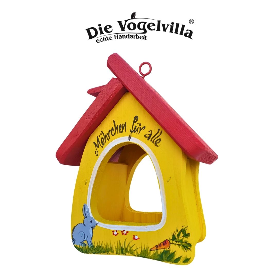 Beide Häuser sind in einem fröhlichen Gelb mit rotem Dach gehalten und verziert mit niedlichen Hasen, die Karotten naschen. Die Aufschrift "Möhrchen für alle" unterstreicht den freundlichen Charakter und lädt Vögel ein, sich wohlzufühlen.
