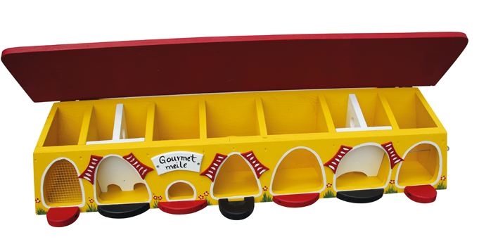 Für jeden Tag der Woche eine neue Futterkammer, die zu befüllen ist: Montags Sonnenblumenkern, Dienstags ein Meisenknödel, Mittwochs Hirse und Haferflocken ... und am Sonntag natürlich Erdnüsse und Rosinen. Wer wissen will, welche Vögel welches Futter mögen, kann mit der Gourmetmeile viele Erkenntnisse sammeln. Ideal an der Hauswand oder der Gartenhütte wird dieses witzige Futterhaus, welches über die Dachklappe gefüllt wird, zum Beobachtungs-Objekt Nummer 1.